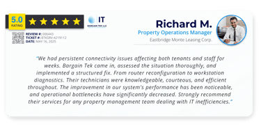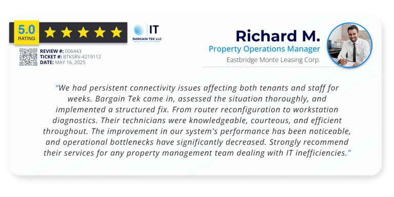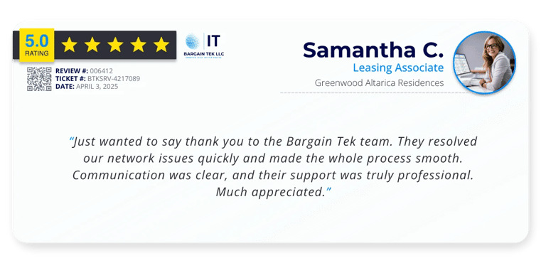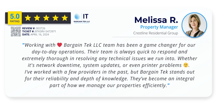 At Bargain Tek LLC, we don’t just fix tech issues. We become your behind-the-scenes partner in keeping operations running, clients satisfied, and teams productive. From unexpected outages to complex network upgrades, our clients count on us to deliver fast, reliable, and future-ready IT solutions.